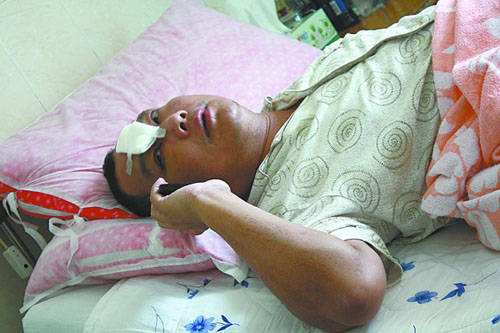 8月5日,记者接到报料来到荔浦县人民医院,赵某躺在病床上,额头和眉毛之间的伤口包着纱布。赵某扯开纱布,记者看到他的伤口还没有拆线,共缝了3针,右边眼角还有充血。