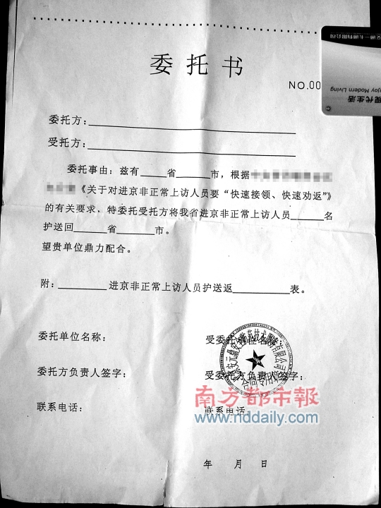 驻京办官员们目睹了整个过程,张耀春说,他们甚至还帮忙扭送上车。但他们不是帮凶,他们是雇主关系,是他们打电话请来了安元鼎。在此之前,他们达成了协议:以政府的名义与安元鼎签订押送上访人员的服务合同。这是安元鼎公司诸多业务中,最赚钱也最见不得光的一项。②
