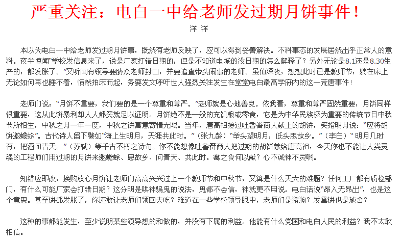 电白一中问题月饼已引起关注,希望一中领导能以人为本,妥善处理此事。否则,问题会越来越严重。 电白领导在出问题之后,最拿手的便是恐吓手下,希望能以此封锁消息。嘿,此招在孔子时代或许有用,但在信息时代特别是网络时代,这招便大失其效了! 相信一中领导不会愚蠢到这个地步!据本人所知,现有好几家媒体正盯着此事,如果一中处理不当的话,则好戏将会不断上演。 相信一中领导能将心比心,而一中教师最终也能讨回尊严。
