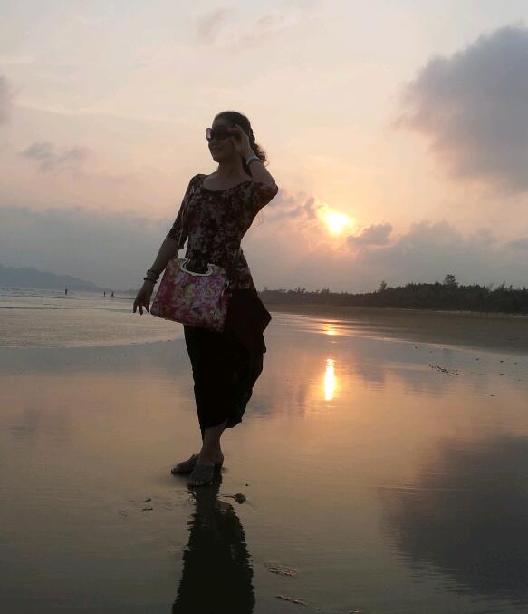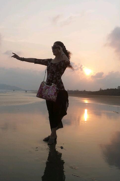 人物与天空、沙滩、大海、夕阳融合在一起,给网友一种艺术美感,着装衬托出女性