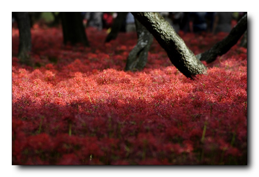 彼岸花是开在黄泉之路的花朵,在那儿大批大批的开着这花,远远看上去就像是血所铺成的地毯, 又因其红的似火而被喻为”火照之路” 也是这长长黄泉路上唯一的风景与色彩. 人就踏着这花的指引通向幽冥之狱
