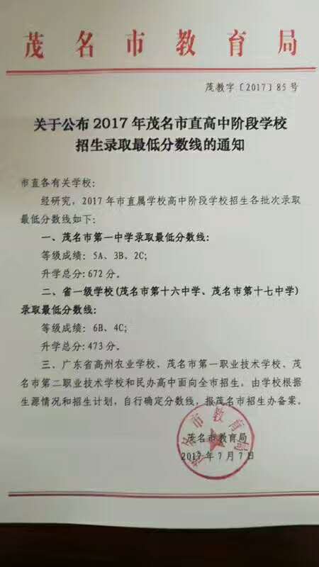 电 电白大排档 小学三年级 注册 2017-07-02 帖子 208 反馈评分 15 点数 1 性别 男 2017-07-08 #10 电白区2017年中考分数线 茂名市一中697分(录190人,697分只录部分考生,同分按语数英三科总分高者排前) 电一中626分(不含指标生及特长生) 电一中附属实验学校438分(与其他学校一样按志愿从高分到低分录取)。