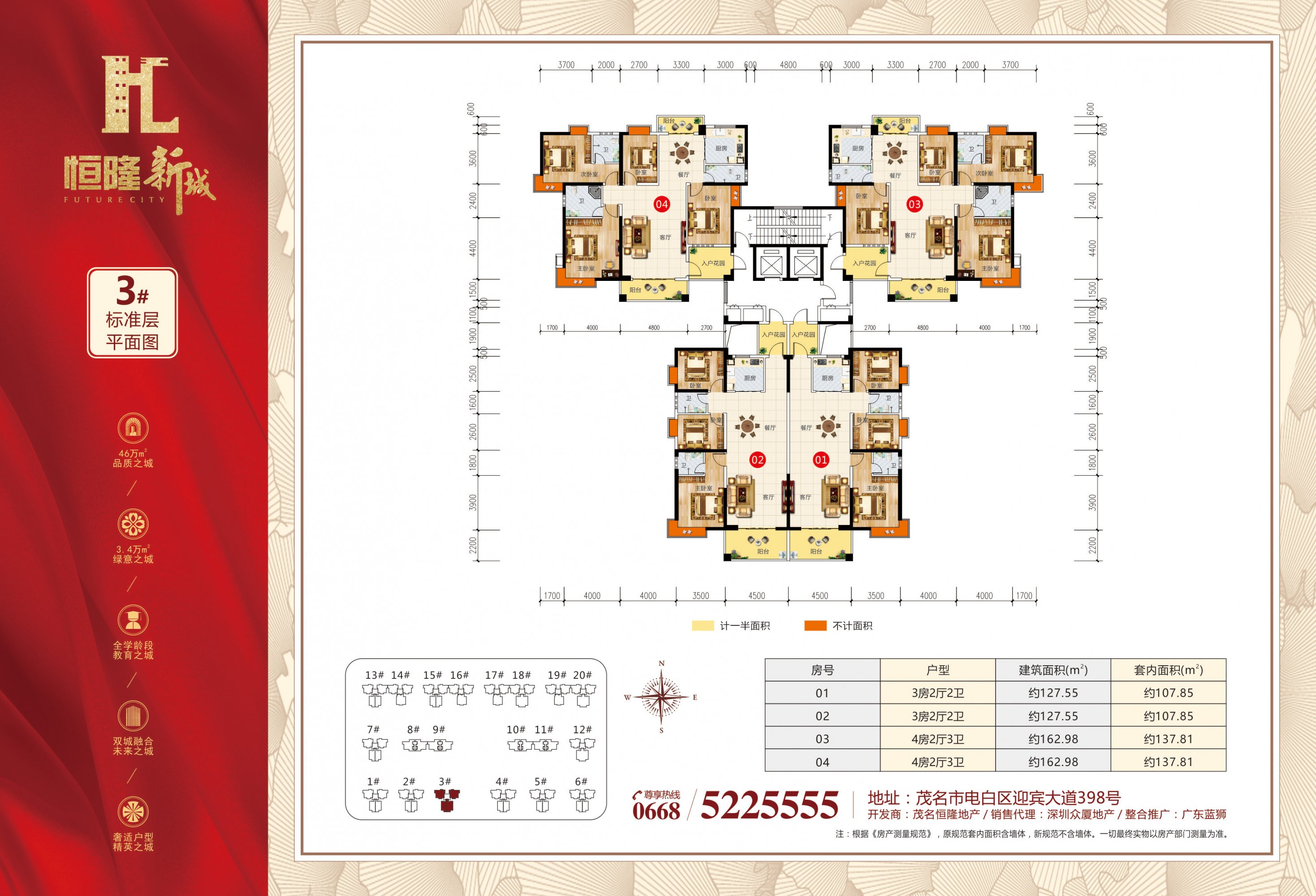 [恒隆新城] 二期开始认筹啦 首期火爆热销原因: 交通便捷、配置完善、价格合理、 100%户户坐北向南、方正实用、楼距超大。 二期正在认筹中 (128方小户型、162方4房2厅3卫黄金户型) 1#楼 2#楼 3#楼 7#楼 销售热线:0668~5225555