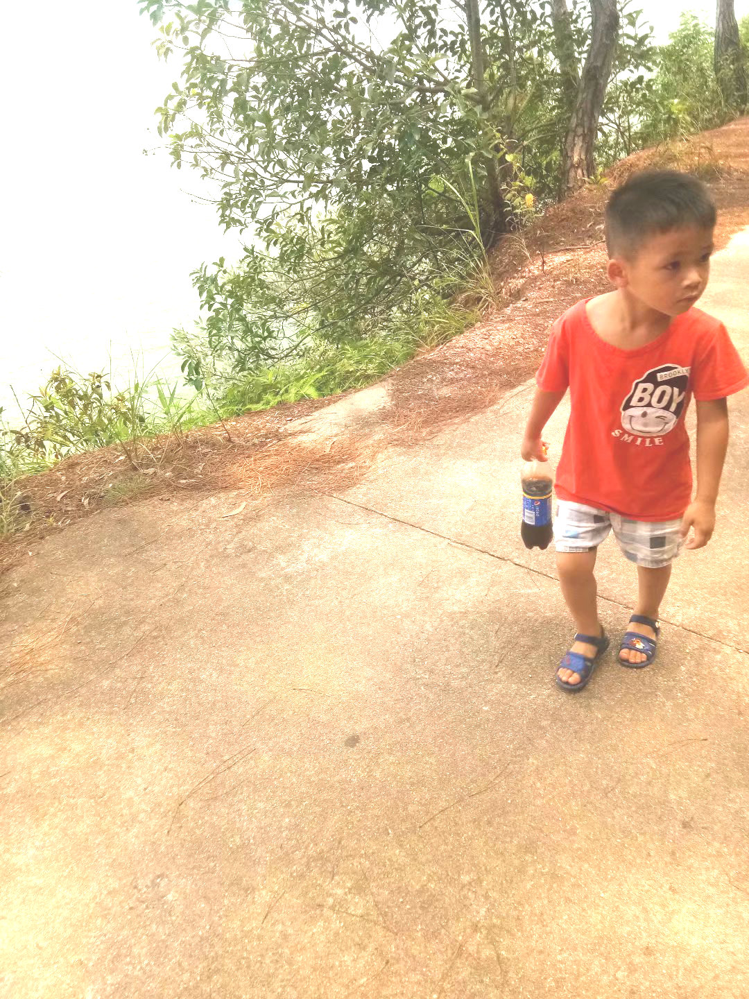 我在高州水库游览时,遇到了住在上九(狗?)山山区的两位壮年农妇,她俩正在进山的分岔小道歇息,我赞扬了她们知足常乐,也欣赏她们有一副强健的身体。进大山的小路可以骑摩托车,小路口有一棵古木,树干粗,高高的,不知树名,要来一个130度角才能望到树梢。我行走的库区山路,不停有山民出现,也有读书郎在游览库区风景,更有一个年轻的母亲,带着一对小女儿在水边休闲,什么叫幸福?对于这位母亲来说,幸福就是一个个愉快的生活小节构成的。我手上有一只近两斤重的乌龟,这是受一位沐恩信士委托从水东带来放生的,我挑选了一处阴凉的水库边把它放归大自然,看着它慢慢游向了那座小岛,一颗悬着的心也放下了……
