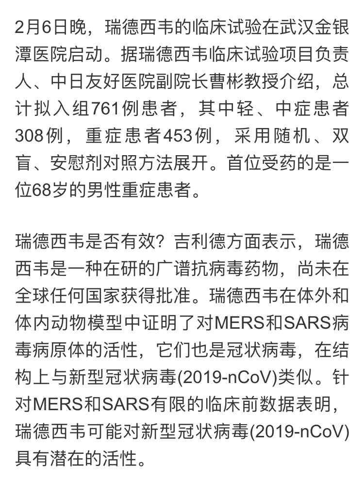 美国吉利德科学公司研发的药品瑞德西韦在武汉进入临床试验,无偿提供研究所需的药物