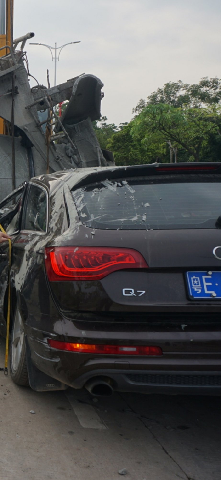 今天下午1点30分,市民大道往茂名大道方向,亿丰门口,一辆搅拌车(车牌:粤K07005)与一辆奥迪Q7 SUV(车牌:粤EA468D)发生碰撞,搅拌车翻车碾压奥迪车,奥迪车司机夫妇当场死亡,现场非常惨烈。