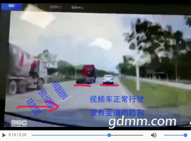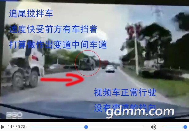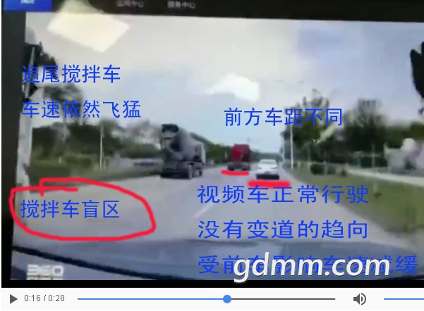 13秒时第二台田螺车走在中间车道,见左车道前有田螺车,自己中间车道有红色拖头,想变道右边紧跟那两台小车超过拖头,然后成为开最快田螺车,第1个赶到工地打混凝土浆,车高有盲区,从中间车道变道右侧车道时,没留意到后面已有奥迪车突然超车上来,奥迪车速快差点冲过去,但还是被中间变道田螺车侧刮到左尾侧,受力后奥迪橫向撞向最左边,发生惨剧!奥迪车超车时见左侧有两台田螺车,以为可以超车甩开,忽然第二台田螺车从左侧变道中间,又一下子变道到右侧了,生生到撞到左尾侧横向冲失控。一般情况下三台搅拌车都想第一时间赶到工地