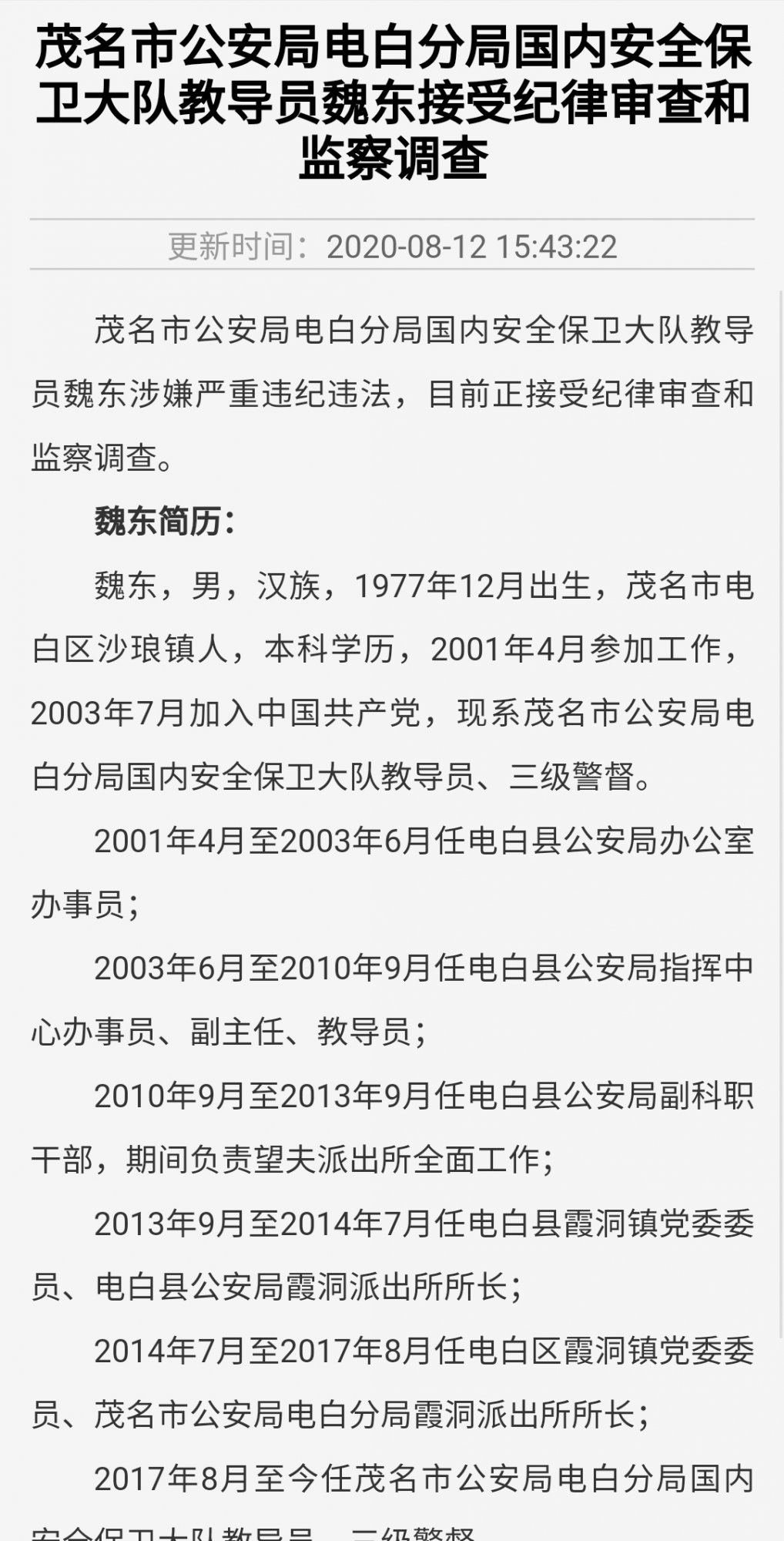 爆料 电白区霞洞镇党委书记官军汉接受纪律审查和监察调查 (2人在浏览)