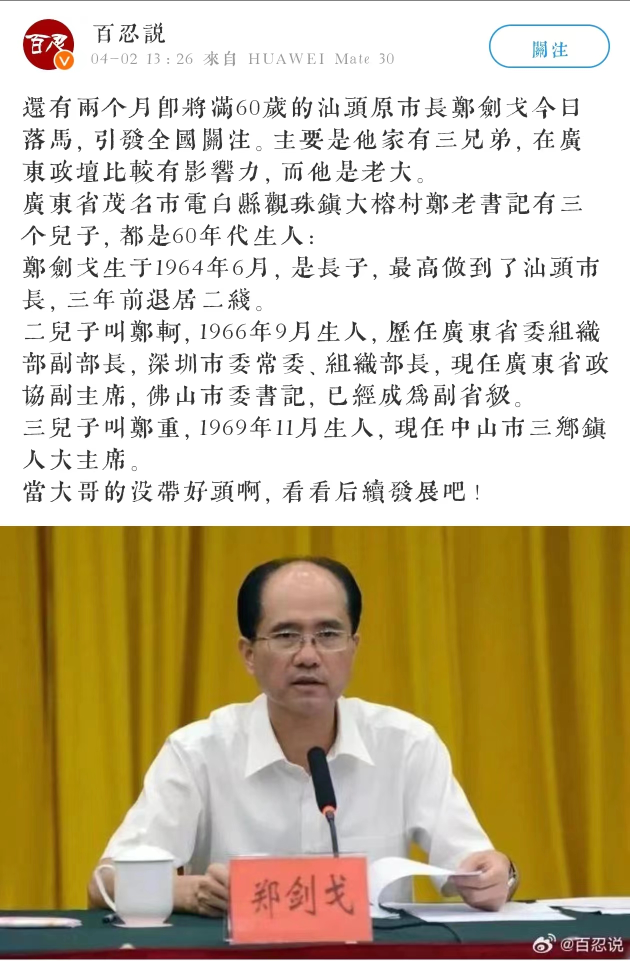 里面有部分内容不真实,老郑不止三个儿子,是五个,影响力大的也只有两个儿子,另一个只是科级干部,说不上在广东政坛有多大影响。