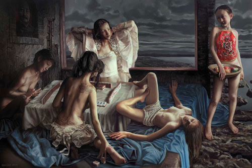 注意看了下, 中间只露出背影的女孩身上纹的是传统的中国凤凰。但身上所穿的却是西洋蕾丝衣物。是不是在说明现在的中国是"中学为体,西学为用"?