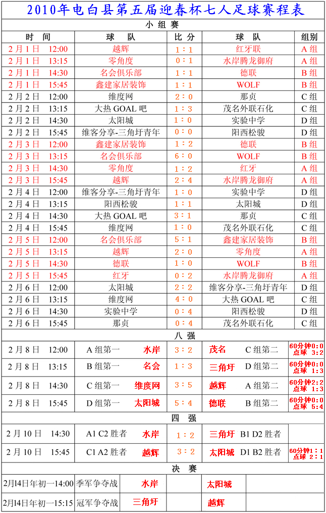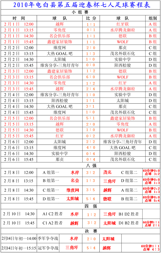 2010年第五届迎春杯七人足球赛全部赛果