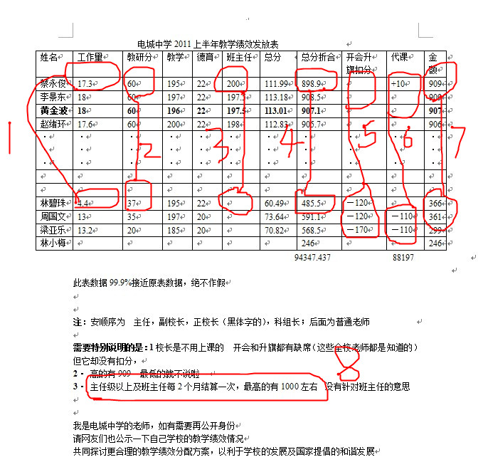 QUOTE(说三道是 @ 2011年10月19日 Wednesday, 01:17 PM) 绩效 [snapback]3248581[/snapback] 对你的表格我感兴趣的有8点:[attachmentid=278309] 1、工作量17.3――4.4(4.4的工作量?多少节课?) 2、教研分60――37(37分?缺多少次没去被扣分了吧) 3、班主任200――0(班主任比非班主任多200,电城中学发绩效倾向班主任哦,是不是没人肯做班主任啊?) 4、总分111.99――60.49.折合钱为898.9――485.5 5、升旗开会0―― -120 ―― -170(被扣这么多可怜哦,10元一次,一个学期17次没来开会升旗) 6、代课+10―― -110(代课10元一次,11次请人代课,人去那里了?) 7、最后所发金额:909――366(被扣还有366。630-366=270,距离平均630一人的绩效不见了270元。909-630=279比平均数多了279元) 8、主任和班主任1000元2个月?(班主任没那么多吧?150元一个月封顶,最高只可以拿140元一个月)