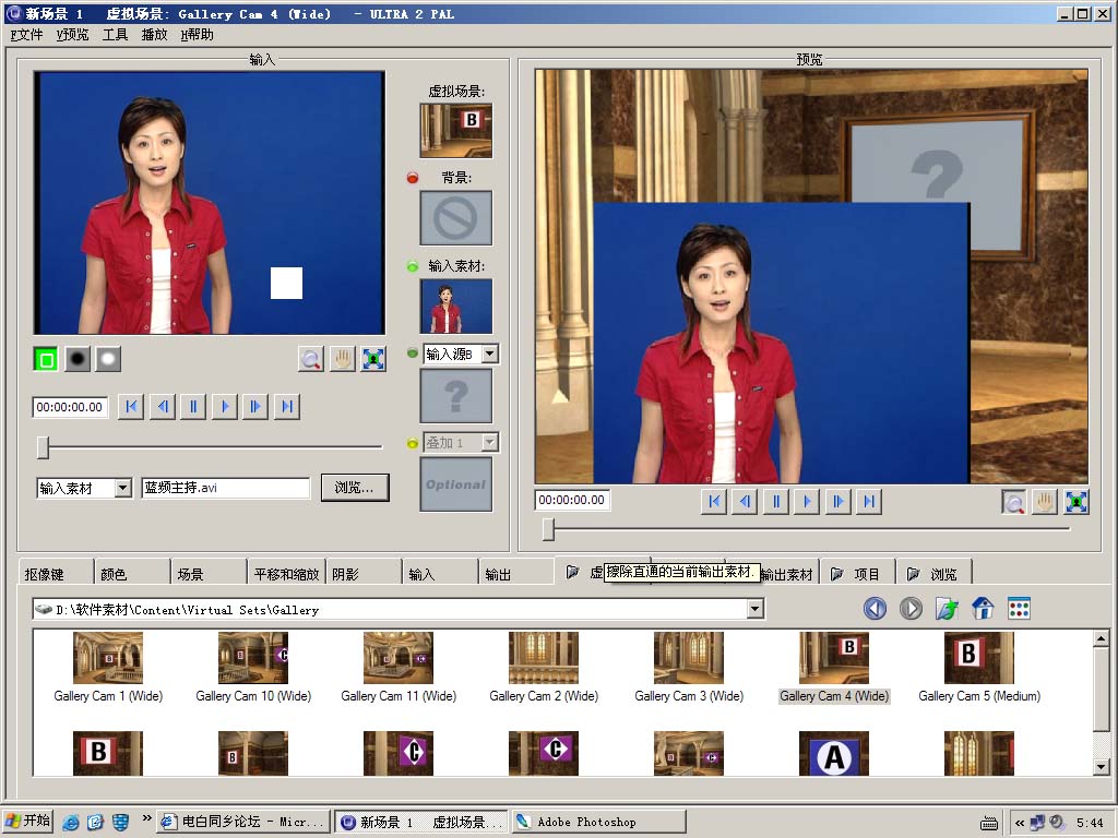 是时候应该改革一下了!现向电白电视台推荐一款不错广播重量级的"虚拟演报室"软件,用上这软件的电视台也不多,国内的央视,省台,和凤凰卫视等~都购买了这套软件,只要有一个好的摄影棚,加上好的灯光设备就可以对主持人进行蓝屏或绿屏抠像!而且也支持今后的高清电视1920*1080等~~里面带很多三维虚拟场景库!可以实时更换!本软件我已经代理了,而且我进行了汉化..方便大家使用..我也写了很多教程,有些杂志也刊登了我的文章和教程,而且我也做了一些视频教程欢迎大家下来!