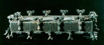 亦称:“五星出东方利中国”织锦护臂。汉晋时代。圆角长方形,绢缘,缝缀六角系带,长18.5厘米,宽12.5厘米,系带长21厘米,部分系带残断。护臂用面锦为“五星出东方利中国”文字织锦,五重平纹经锦,经密220根/厘米,纬密24根/厘米,宝蓝、草绿、绛红、明黄和白色等五组色经根据纹样分别显花,织出星纹、云纹及孔雀、仙鹤、辟邪虎等禽兽纹样,纹样题材新颖、风格别致;每组花纹循环为7.4厘米,上下两组循环花纹之间织出“五星出东方利中国”小篆文字。白色绢缘系用一通幅的绢条缝制成绢经密50根/厘米,纬密40根/厘米,系带经密60根/厘米,纬密28根/厘米。现藏于:新疆区考古研究所。