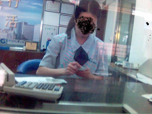 柜台那个戴眼镜的工作人员`没理他..只是在帮另两个人在办理业务...