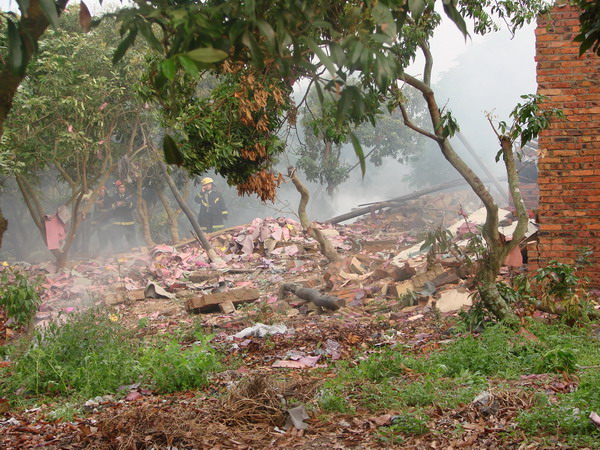 于茂名市茂南区山阁镇金塘岭果场内。昨天下午17时,记者赶到现场时,种植着荔枝、龙眼的果园内依然弥漫着一股混合炸药的气味。该爆竹作坊原本由8间砖瓦平房组成,面积约200平方米,如今5间平房已被完全摧毁,剩下3间尚保持完整。到处都是瓦砾及大量没有装炸药捆在一起的爆竹,烟花纸张被撕裂得满地都是。