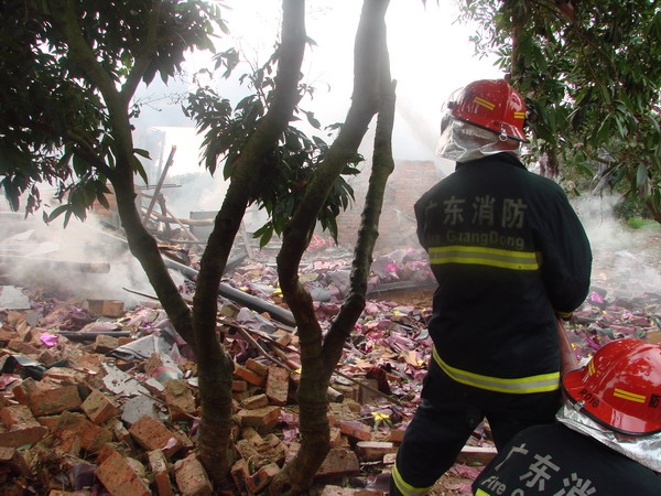 当地派出所接到爆炸警情后,马上组织民警及治安队员共6人赶到现场处置,不料又发生威力更大的二次爆炸。加工场内供生产、堆放爆竹的5间瓦屋被炸得支离破碎,两人被爆炸的巨浪掀起抛出10米开外,两人被当场炸死,埋在瓦砾堆里的尸体烧焦变形。其余还有8人受伤,其中一名民警伤势较重,头部挫裂肋骨全断。