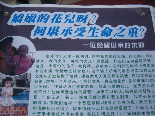 崔若_,一个乖巧听话的三岁小女孩,她爸爸崔勇是霞洞镇供电所职工,妈妈崔韬为电白县第三中学教师,本是个一家三口的幸福小家庭,便二个多月前灾难就降临到她们头上,小女孩突患白血病,而且病情复杂。崔若_发病后先在茂名医院治疗就花去医疗费二万多元,后转院广州中山一院至今一个半月又花去医疗费五万多元,虽然病情得已控制,但最终须做骨 髓移植。单凭做较简的的脐带血移植术就得二十五万元,加上半年的长期治疗,总计治疗费用三十七、八万元(院方估计),这个巨额数字对一个低薪收入的家庭来说是不可思议的。连日来,我妇联从本镇各中小学、各部门发出倡议捐款救助,总计捐得人民币四万多元,她家倾家荡产,东筹西借凑了七万多元,总计十二来万元,这与三、四十万元的费用相去甚远。现在崔若_一家人已深陷苦海,身处绝境,如不继续治疗,这小弱女将离开人世。多么可爱的生命,多么脆弱的小生命啊!小若_是我们的同胞,是我们的小妹妹,她多么需要人间的温暖啊,多么需要大家的关爱啊!在此,我霞洞镇妇联再向我们县级、市级各界人士发出倡议,为病床上的崔若_伸出援手,为她献出爱心。
