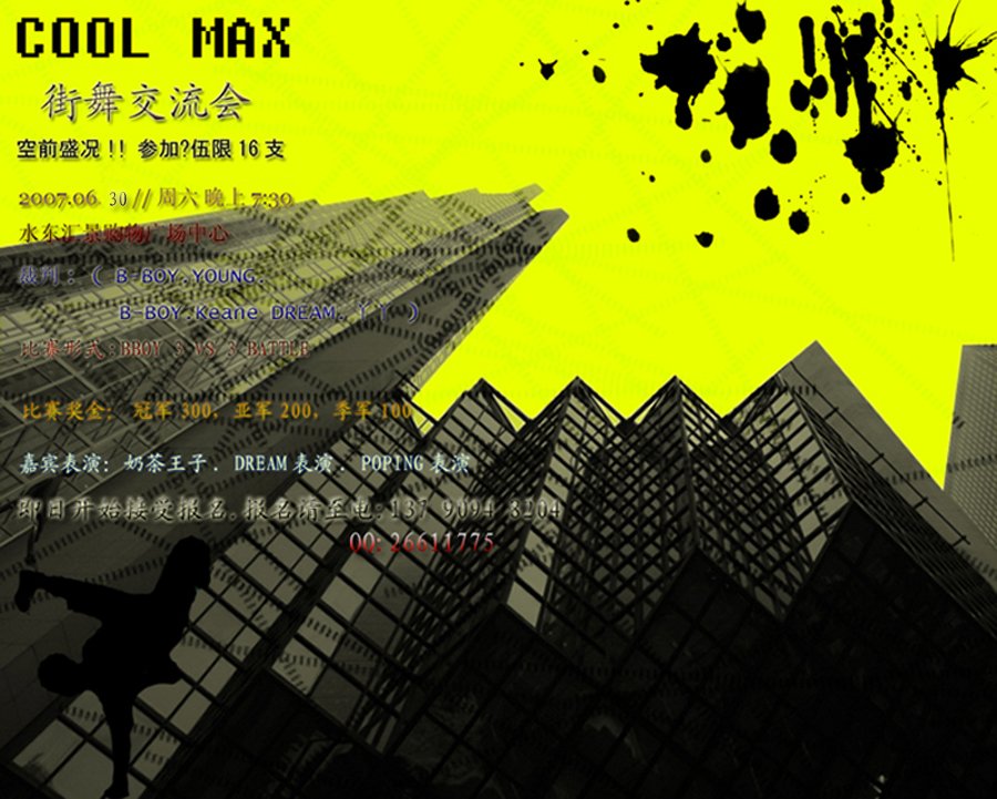 【 COOL MAX.街舞交流会 】 裁判: ( B-BOY.YOUNG. B-BOY.Keane DREAM.丫丫 ) 比赛时间:6月30日 晚上 7:30 比赛场地:水东汇景购物广场中心. 比赛形式:BBOY 3 VS 3 BATTLE ( 参加队伍限16支 ) 嘉宾表演:奶茶王子. DREAM表演. POPING表演 比赛奖金:...