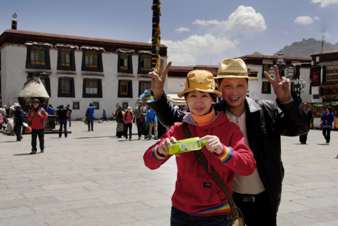 路边不是草原就是沙漠,一望无际,汽车经过了美丽的青海湖,经过了藏羚羊的天堂,经过了牦牛的聚集地,经过了出名的温泉之地羊八井。。。。。。就这样一路把我带到了拉萨。 如果说高原反应,在我到达拉萨的前一天就开始了高反,因为当时汽车经过海拔5000多米的唐古拉山口, 以下布达拉宫门前合影的帅哥是同一班车来西藏的,看到我拿专业相机就缠着要我一起去布达拉宫门前留影