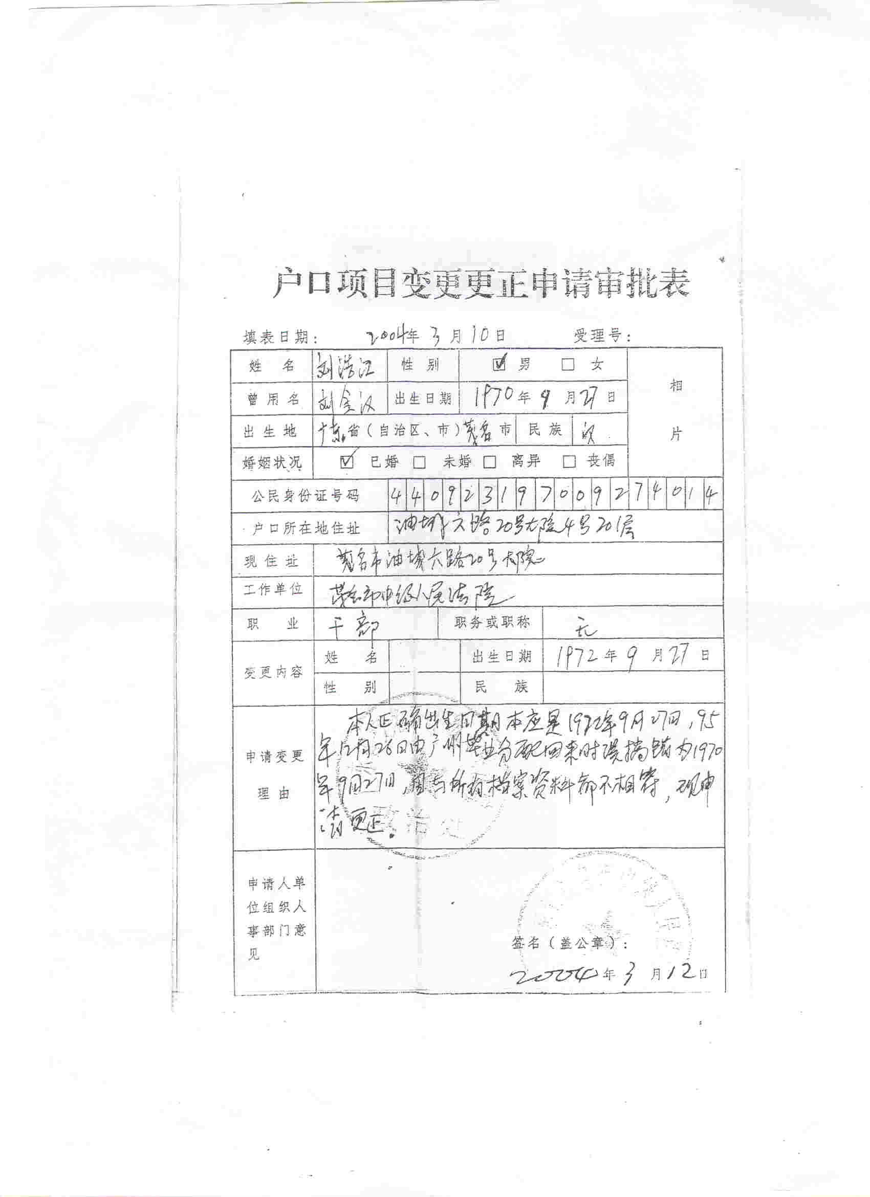 茂名市中级人民法院民三庭刘浩江,1970年9月27日出生,1995年7月参加工作,2002年8月刘(1970年9月出生)被任命为民三庭副庭长,2004年3月刘偷盖中级法院政治处印章到茂名市河东派出所改年龄,更正表是先盖章后写字(刘本人所写),没有中级法院领导签著的意见,刘将其年龄由1970年9月出生改为1972年9月出生。尔后,刘通过行贿手段搞定政治处某人对刘的档案年龄进行涂改,改为72年9月出生,2006年6月茂名市人大任前公示刘为民三庭庭长时,公示刘为1972年9月出生,茂名中级法院的干警十分愤慨,即向市人大反映刘涂改档案年龄和私改身份证年龄的违法违纪行为,认为刘思想品德极差不应提拔,但因为刘有钱也有后台(刘的后台是其老乡原茂名市常委副市长杨光亮2009年10月被双规)摆平此事,刘得以“顺利”被任命为民三庭庭长。2008年8月刘又被任命为审委会委员,干警再次反映其年龄造假一事,但还是被刘摆平,当时刘更是口出狂言:你们告我一次,我就结多一批朋友,官也升大一些。正所谓应了哪句:官升大了,年龄也小了。