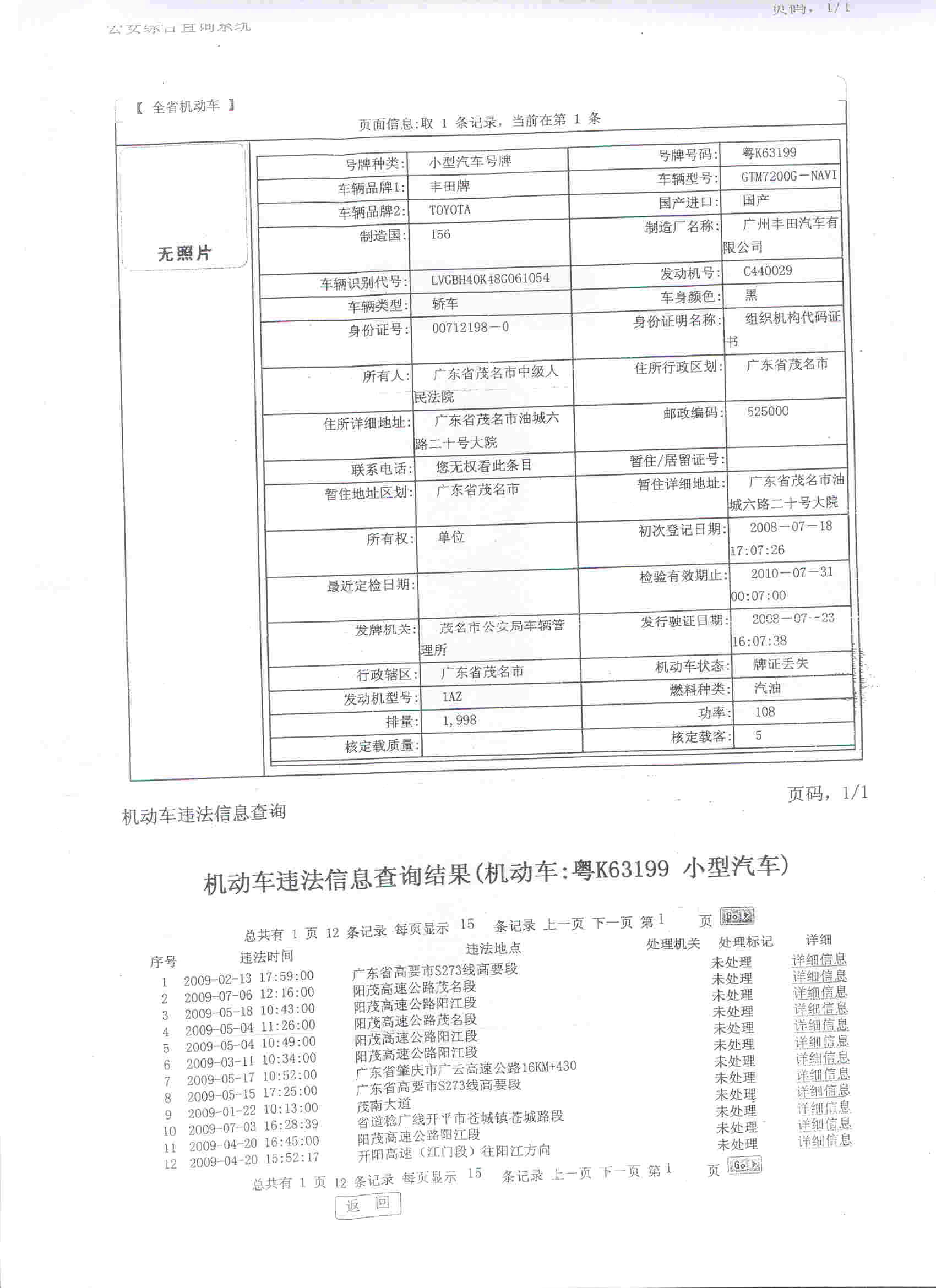 二:我们的院长大人要一个人同时开三辆汽车。从2005年3月上任以来。一人同时占用三辆汽车,第一辆为排量3400千克的丰田吉普车,价值60多万元,车牌:粤OKA5008(特种车牌);第二辆为排量3000千克的豪华商务别克面包车,价值30多万元,车牌粤KA0075警;第三辆为2008年7月18日,茂名市中级人民法院花费25万元购买了一辆丰田凯美瑞小车,车牌为:粤K63199,但该车并从未出现过在法院,而是由其秘密交由远在肇庆的老婆黎某使用,不在该院出现过的车却每月却要单位报销一万多元的各种费用(茂名中院可查),该车就2009年1月至7月几个月时间,就有12次的违章记录(付有违章记录表和车辆登记表)。对于该车全院有99%的干警并不知道。谭掌泉利用职权,以权谋私,其行为严然已构成贪污。堂堂一个厅级干部竞然贪污一辆新入户汽车,交由其老婆长期占有使用,法院中本身就车辆不够用,而被该人就占用了三辆。