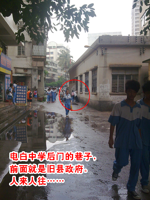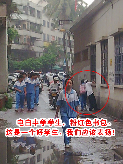 【引语】这是电白中学后门一巷子,这天我坐在朋友的车子的后面,所以慌忙中拍下了这张没拍到正面的照片。事情是这样的,一位老人行动不方便,只能趴在墙上缓慢进行,样子艰难竭蹶……于是这位女生给予纤小力薄的帮助……这种精神不是我们要弘扬的吗?我们应该找到她,学校应该给予鼓励表彰!!