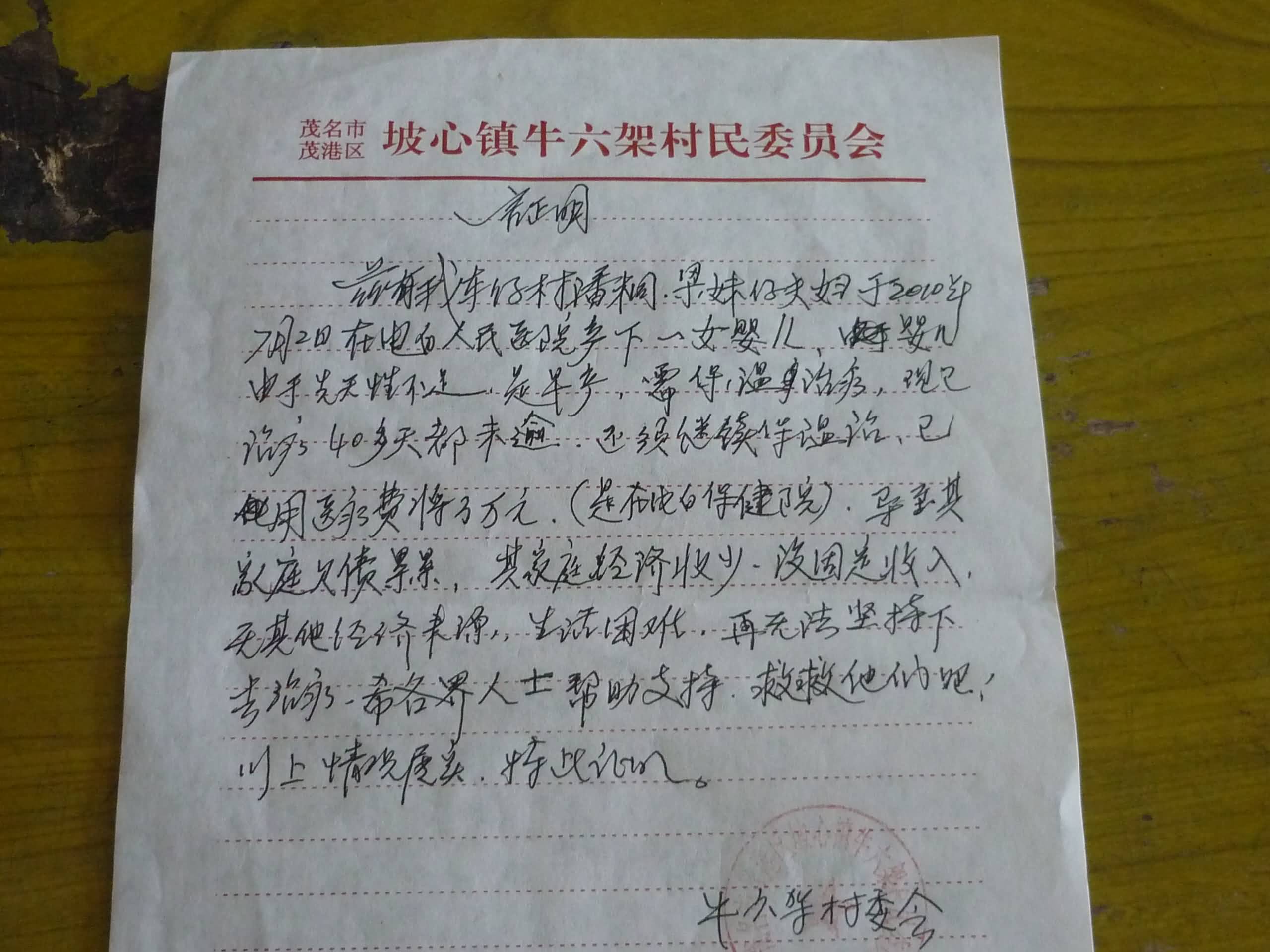2010年8月18日上午,电白义工及爱心网友一行6人,匆匆赶往电白妇幼保健院,他们欲劝谕一对因无钱医治自己小孩的父母勿放弃对小孩的治疗。在五楼的新生儿科,我们见到了面容憔悴的小孩父母,挂在他们脸上的更多是是无奈与哀愁,他们现在还欠着医院的四千多块的医疗费用,即使是要提前出院,如何结清这笔费用也足已让他们一筹莫展