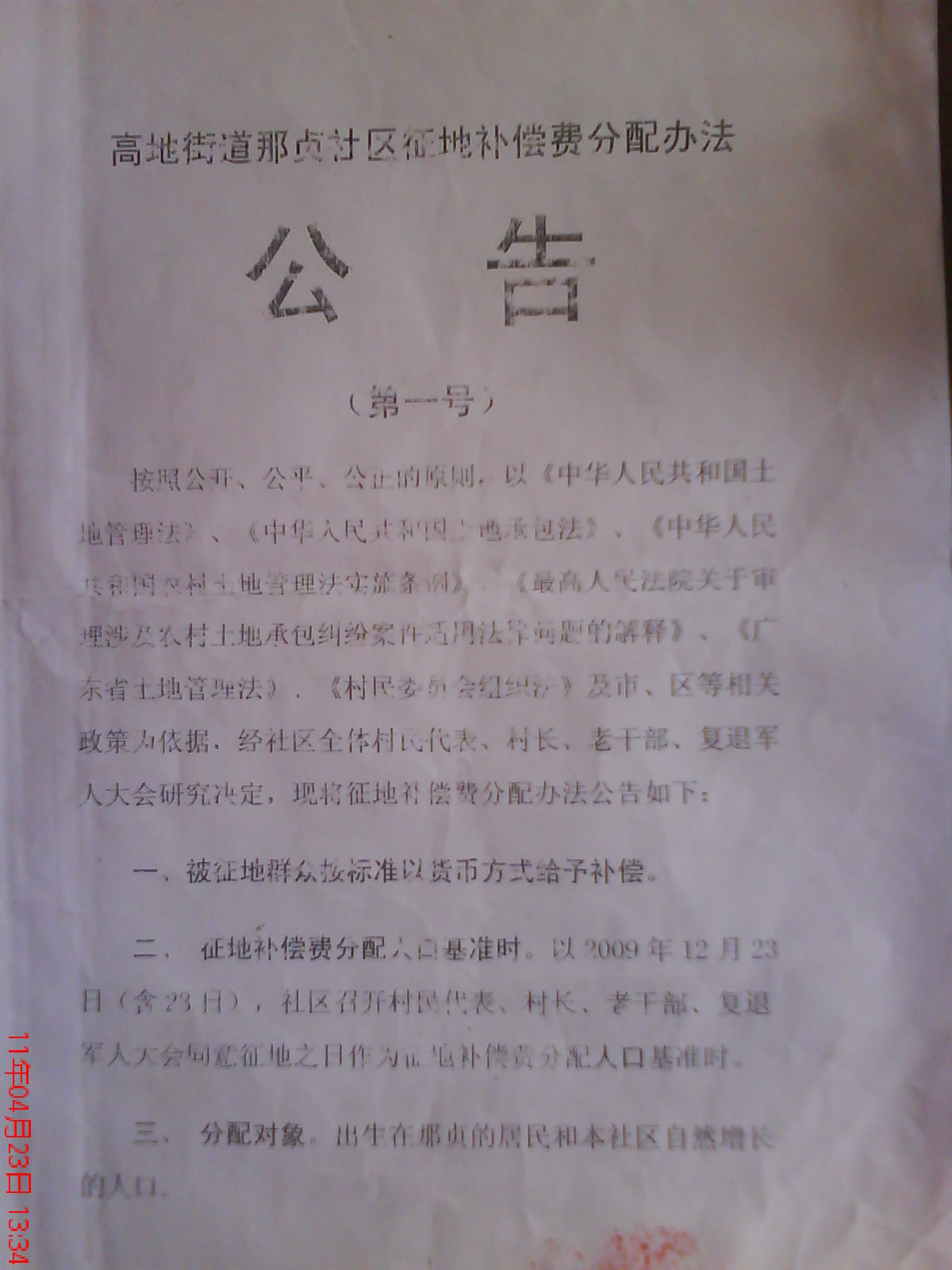 我手上有我的证明及《高地街道那贞社区征地补尝费分配方法公告》与村中已经分得土地补尝款的人员名单,只是没相机,上传不上来!!