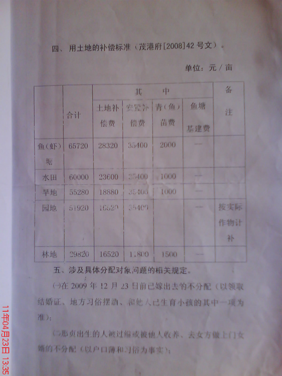 在于2009年12月23日(含23日)那贞社区征收民用海田,同时出份文件《高地街道那贞社区征地补尝费分配方法》,并在2009年12月23日量土地。