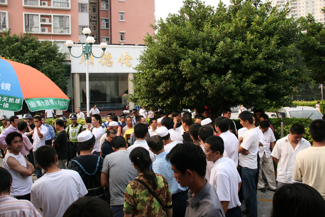 2007年10月28日,一个兰州拉面的送拉面进某住宅小区时,小区保安要他登记,引起冲突,他们叫来几个戴白帽的人把保安打了,保安一拦他们讲道理报警,又冲突,他们装死躺在地上,警察来了把他们送到医院,他们又跑回来躺在小区出口装死,陆陆续续来了几十人冲击小区,十几个防爆治安员及几个警察都拦不住,最后一警察向天开了三枪了拦停这些白帽人。此事,该小区赔了2个装死的人5-6万元。