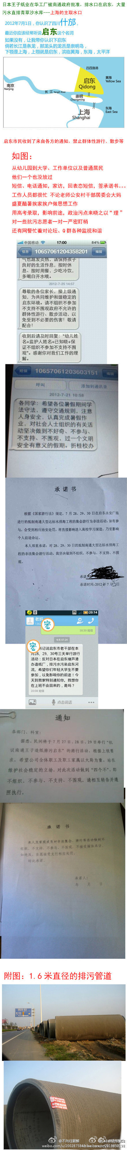 日前,江苏南通当局批准某日本纸业在当地设厂;工厂的排污水口设在启东市,当地百姓强烈反对这项建设,因而引发周六的这个游行抗议活动。