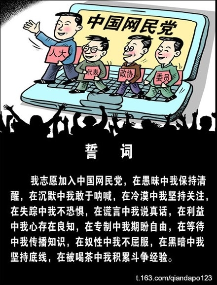 “中国网民党”誓词称:我志愿加入中国网民党,在愚味中我保持清醒,在沉默中我敢于呐喊,在冷漠中我坚持关注,在失踪中我不恐惧,在谎言中我说真话,在利益中我心存在良知,在专制中我期盼自由,在等待中我传播知识,在奴性中我不屈服,在黑暗中我坚持底线,在被喝茶中我积累斗争经验。”