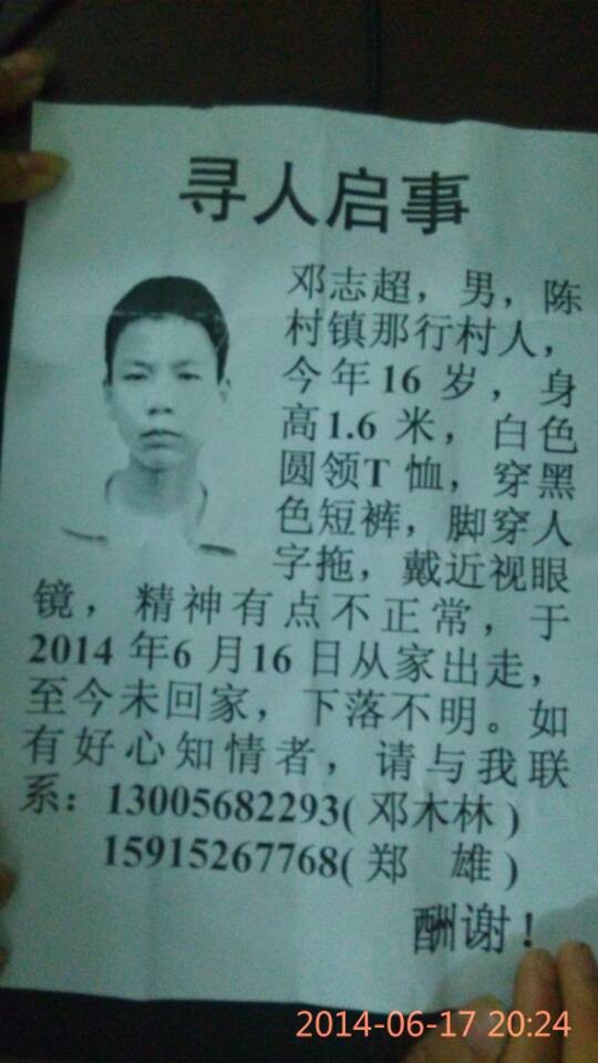 QUOTE(byronroy @ 2014年06月17日 Tuesday, 09:09 PM) 还有,若其他同乡家里有亲人需要,给他们戴个GPS 定位的设备,淘宝大把。 有智障的、幼儿或者老年痴呆类,要多关心… [snapback]3657184[/snapback] 他就是有点内向,不爱与人交流。见了陌生人好像见鬼一样躲起来,在家很少出家门,没什么朋友。寻人启事,报警等都做了 现在就希望能有好心人看到他。。。 谢谢你的关心