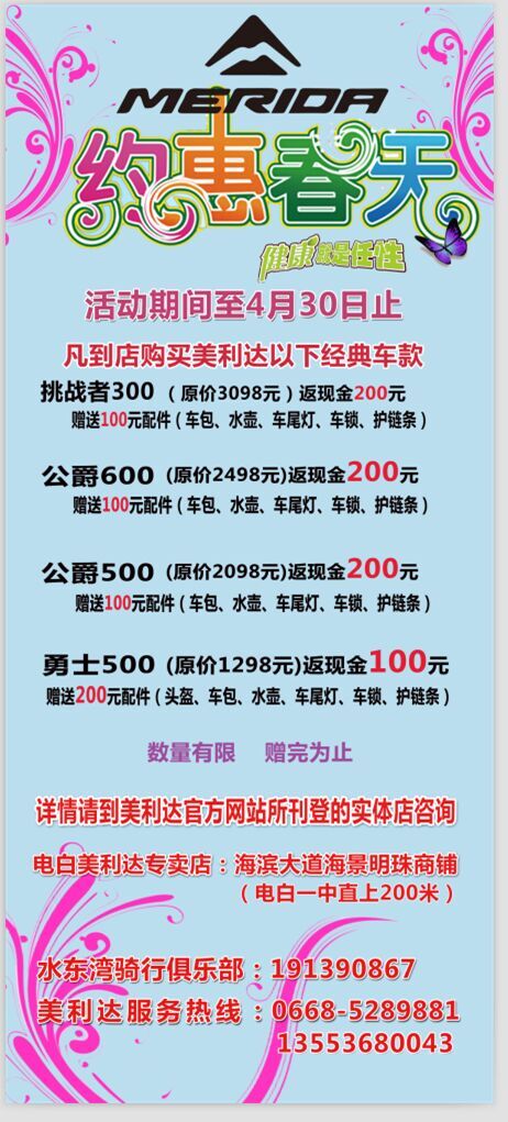 在漫长的冬季,我们曾为迎接春天做了很多的运动计划,在春天这个美丽的季节,和恋人、朋友、家人到大自然中骑上单车,既可体验春暖花开的美好,也可锻炼身体放松心情。 在春暖花开的春天,骑上美利达单车,即欣赏了美景,更重要的是赚得身体健康,这是人生比有钱更任性的事情! 美利达专卖店地址:电白区海滨大道海景海珠商铺(电白一中直上200米) 服务热线:0668 --5289881