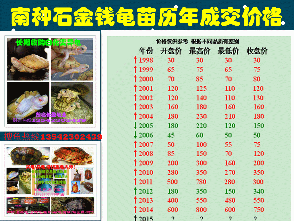近年来黑马频出,2012年安南,2013年黑颈,2014年黄缘都火了一把,对各养殖户都是一个利好的结果,我也曾迷茫过奋斗过,追过安布,赶不上金边,看不上大青,只能选择石龟玩玩了(太便宜的巴西没有意思),所以从断尾货到变形货到精品货慢慢醒目了,个人分析下石龟为什么火爆。一,主导性。有一定市场的认可了,基本10家养龟9家是石龟,你会反过来问,那么多人养,以后不值钱了,但是永远记住群众的眼睛是雪亮的,群众家庭养殖要考虑成本和收购,方便出售,容易养大,繁殖要求技术不高,亲戚朋友养的比较多,经验交流方便,效益快,要求占地小,一个10平方养殖保温话的,可以立体养殖,方便管理。这点跟石龟相似的只能是大青了,但是大青总体养不大,不能类似石龟能养大到四、五斤,耗的时间、龟食相同,效益不明显,虽然苗价占优势,收购成问题,两广的中介基本没有上家都不会去收大青,石龟的话就不同,这家不要那家要,大不了自己压,所以石龟决定了龟行业价格走势的方向标。二,信心性,信心比黄金重要。石龟跟金钱龟一样起伏,稳步上升,早批入市的石龟养殖户现在都致富了,个个起高楼买豪车,这给后进者树立了“要致富,养石龟”的信心和榜样,带动更多人养石龟致富,而“先富带后富”更在龟协、养石龟大户的实际行动中得到体现,例如,2011年石龟苗价格在一路窜高到780元后突然断崖式下跌到280元一只仍无人问津,石龟市场一下迎来了冰冷的“冬天”,各地龟协、养龟大户紧急联络、行动起来,不计赚赔,各拿部分资金出街收购龟苗救市,这下一下子又给广大石龟养殖户吃了定心丸,石龟市场迅速止跌回升,又转回到了购销两旺的“春天”,这就是一种无形的正能(力)量,也是保证石龟市场一路走强的信心体现。三,稳赚性。这几年养石龟只要不养死都会稳赚不赔。石龟就好在这点,也是很多老板入行的跳板,新手增加信心的动力,其实我一路过来都是这个给了我帮助,没有养龟前,储蓄卡是有钱的,养龟后,工资一发就去买龟,其实什么分析都是假的,看自己口袋是真的,但是坚信一点,只要龟能出苗、出碌、出种,养的过程龟不养死就稳赚不赔,胜过存钱在银行,存钱,利息赶不上物价,炒股,十家炒九家赔,炒楼,山穷水尽迂无路,故特看好石龟养殖,石龟适合长江以南半个中国养殖,可以预料,南石龟、北黄缘必将成为中国最有群众基础、最有“钱”图两大龟类养殖品种,目前石龟龟苗数量虽然已有一定的规模,但在十年八年内,别说能满足半个南中国养殖发展需求,单单就是对两广日益扩增的养殖户也是供不应求,如果计算到石龟那日真正走上普通老百姓餐桌的需求,估计在三十年之内都是一片欣欣向荣!整天在网上胡说石龟快崩盘的人,要不是脑子已进水,就是手上未进龟(想踩低石龟好扫货),故对此不必理会,只需对石龟发展前景一贯的看好,在上班之余,通过自己的小积蓄投资三、五万养小一池石龟,既不会影响日常生计,也图个“金钱归来”的好意头,还在给龟喂食洗池过程增添了不少生活乐趣,而且希望哪一天,看到那么多早入行的人三个龟换一套房,也希望我的龟能换个车什么的就可以了。这年头,钱攒在手里越来越贬值,今年能买一头牛的钱,明年可能只能买到一只鸡了,前辈说,钱要放到水里浸才能“发”,外行人可能听不懂这句话意思,内行人能懂,意思是有钱不要藏着掖着等着贬值,要化钱为龟放在水池里浸(养)才能发大财。这2014年过去了,回过头想想,这年自己赚了多少钱,数数自己的出的龟或入的龟就知道了,龟友们喜欢本文就分享朋友圈吧。