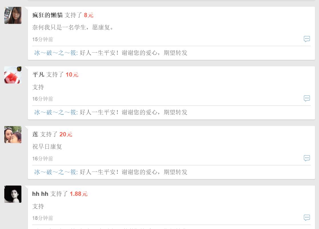众筹平台从早上开通到现在,一共接受了五百多热心人士的捐款,暂筹资金27682.53 电白三中许多老师自发为王老师在自己朋友圈和同学群里转发,还有王旺老师曾经的学生・・・・・・以下是在众筹平台截图 人太多就不一一截了,以下是链接大家都可以进去关注一下。 http://m.qschou.com/project/4c79e852-be1f-...echat&shareto=2