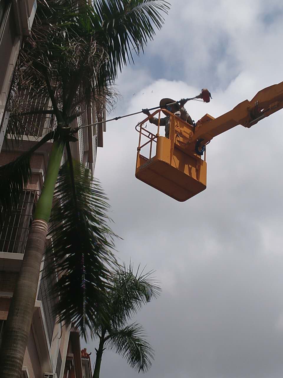 8月12、13日,区城管局路灯所配合园林工程管理所顶着烈日高空作业,周六日加班对城区绿化树进行修剪、矮化。