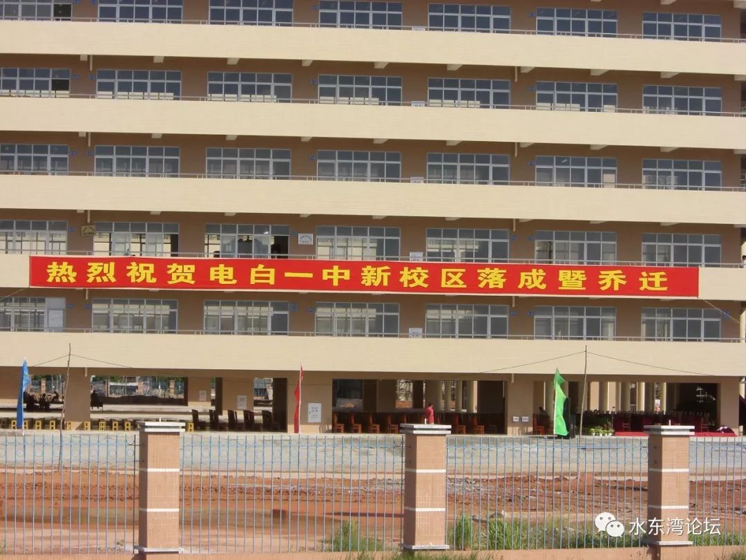 2006年8月30日,天气晴朗,蓝天白云,电白一中搬迁到新校区。整个校区只有那六幢教学楼可以用,只有一条环校道是硬底化。接下来的两、三年,一中的师生经历了什么呢?生活上的不便利、教学设备的欠缺,校园建设严重滞后,停电停水常有、碰上下雨天,经常是脚踏黄泥水到教室,全体师生为校园植树种草是常见的事,体育课、电脑课、学生活动怎么办?可以想象一下当时的景象。还有晚上回校看晚自习,下班的路上,一个人根本不敢走夜路……但那时那些困难全体师生都克服了,他们也成为新校区的开荒牛。