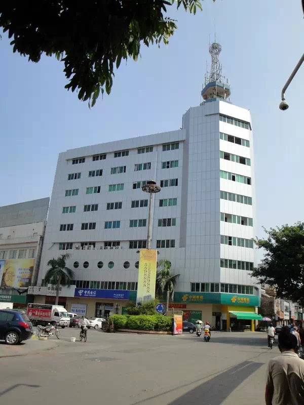 这张照片与我的印象里的中心台对不上号,因为中心台南侧是电白县饮食服务公司下辖的冰室(一楼)、摄影院(二楼)、人民饭店(一层屋),北侧是邮电局,东面是水东解放街街口,街口右侧县百货大楼,县百货大楼今犹在,只有两层楼。