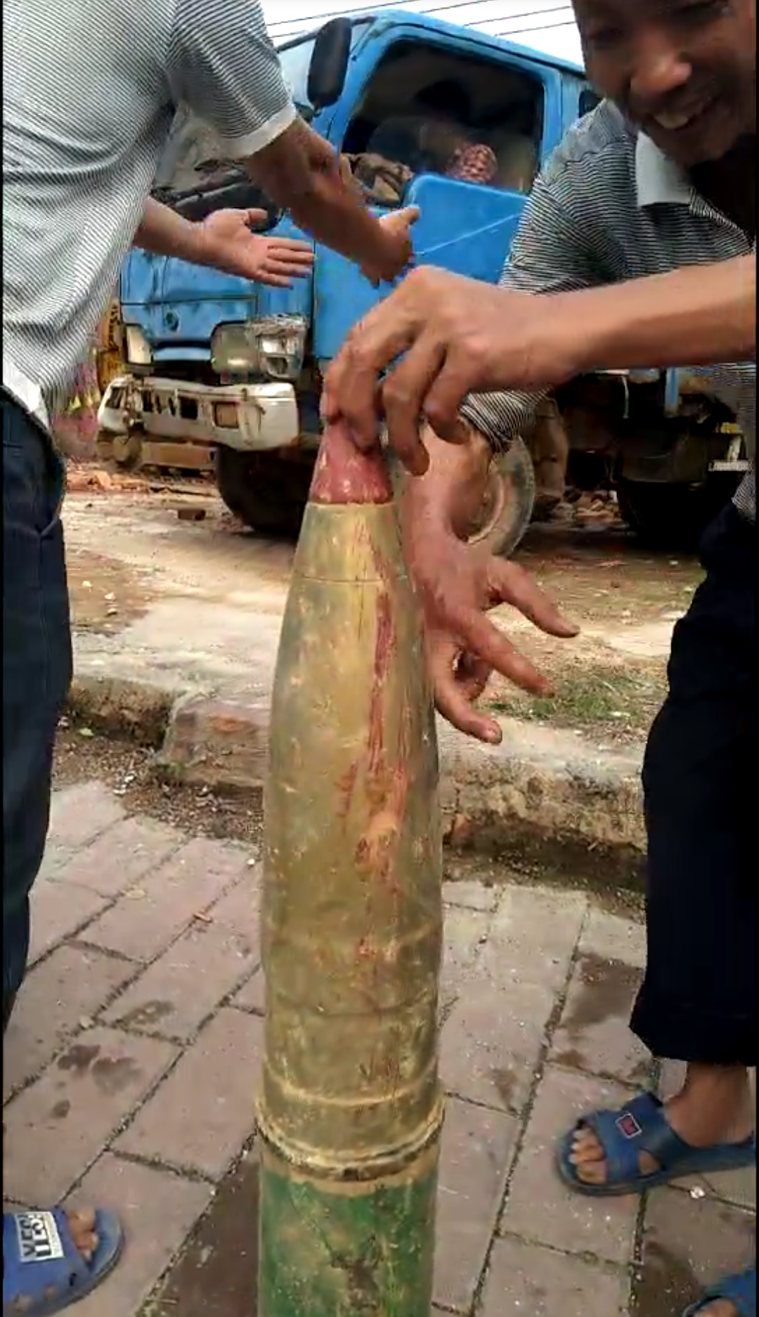 吾眼盘,应该是现代的工艺品,用真炮弹经无害处理过。真的炮弹,药筒应该是黄铜色而不是绿色,弹头也不会是黄铜色。如果是真的实弹,特别是装上引信的炮弹,是很危险的。