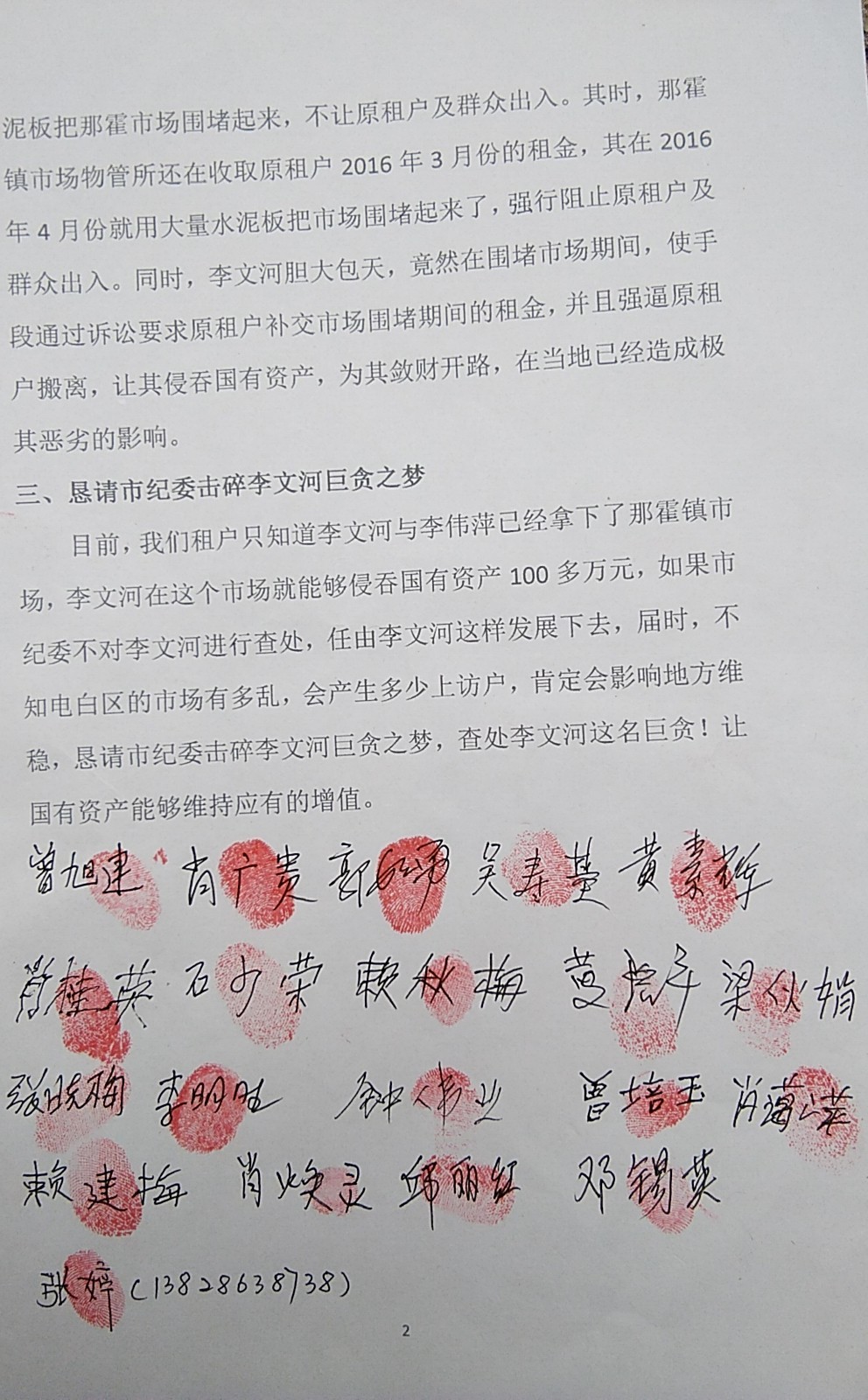 我们是电白区那霍镇农贸市场的原租户,现集体请求茂名市纪委查处巨贪一一电白区市场物业管理中心主任李文河。理由如下: