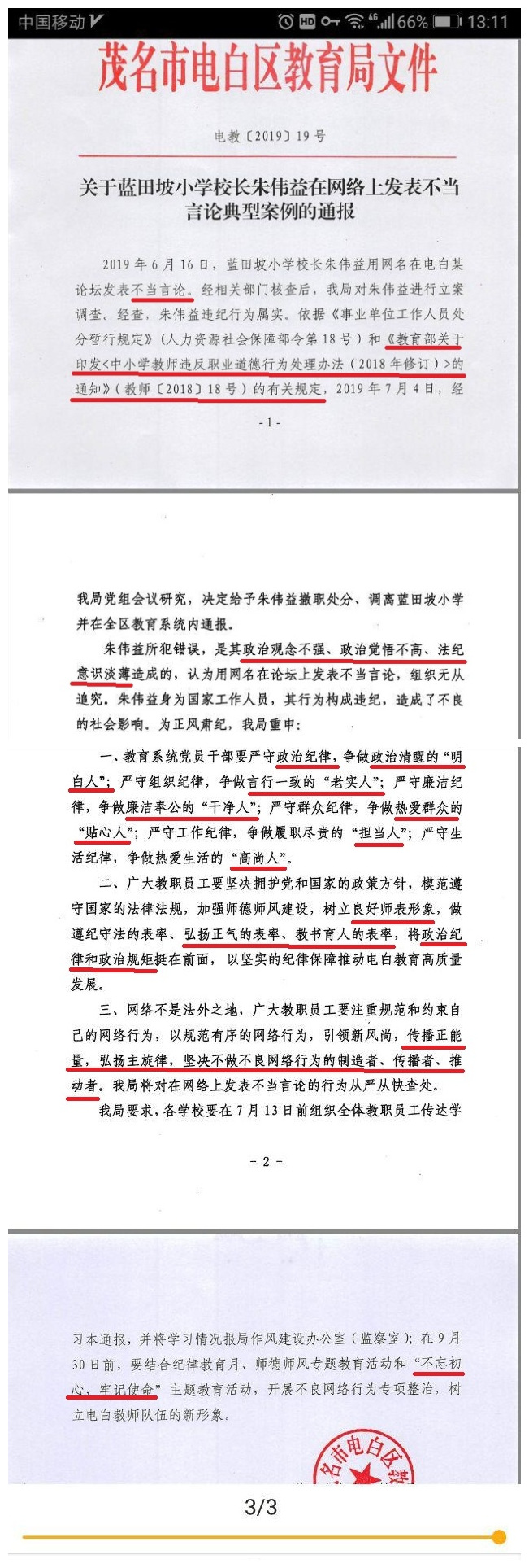 蓝田坡小学朱校长作为一名有良知的知识分子,在电白区创卫期间,关心师生健康问题,发了个垃圾焚烧臭,方圆十里都能闻到的帖子,这是对当地政府创卫工作不足的真实反映,当地政府应该感谢朱校长才对,但政府第一时间不是解决问题而是解决指出问题的人。说真话的校长不但给撤职,还语焉不详地扣了各顶大帽子作为典型通报批评,这是对读书人极大的侮辱。