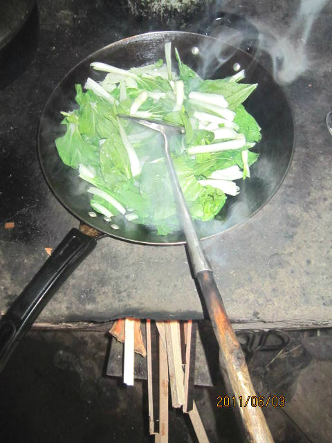 这户职工应该属于困难户,他(或她)家锅里煮的白菜连花生油都不多放一点,柴火是从外面捡回家的