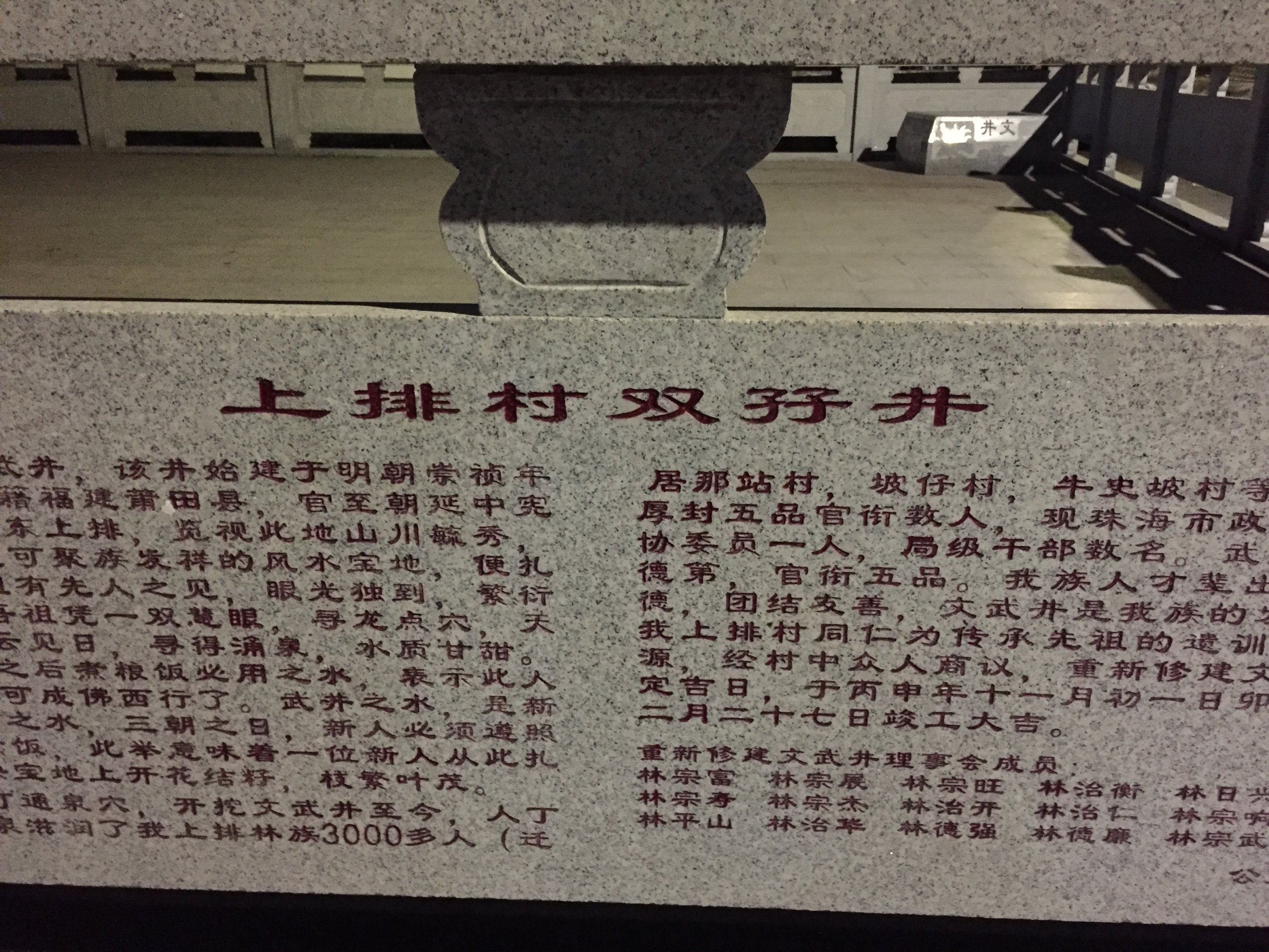 东湖旁边那个村庄的村边有二口古井,叫双孖井,又叫文武井,始建于明朝崇祯年间,当地人保护得很好,用大理石围起来,保护面积有二百几平方,是上排村的生命之水