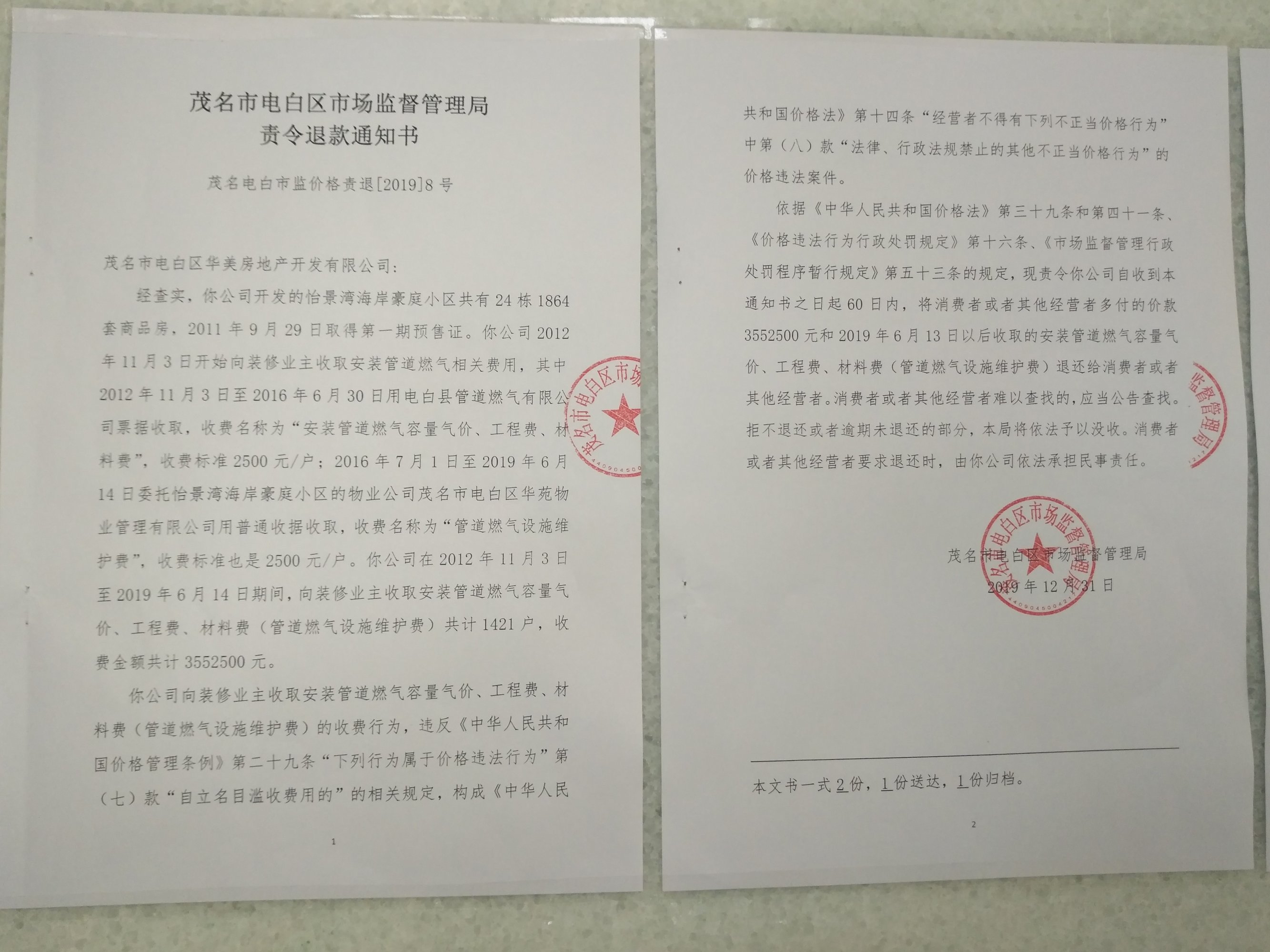 去年政府已明文通知开发商不得收取业主燃气安装费,但怡景湾还违规收取每户2500元!有关部门已经发放管道煤气初装费退款通知书给开发商(物业公司)老板张福子,他拒绝签名,市场监督管理局已经和公证处一起留置送达。 张福仔偷偷将通知书撕毁。 政府法令在张福仔眼中不如厕纸