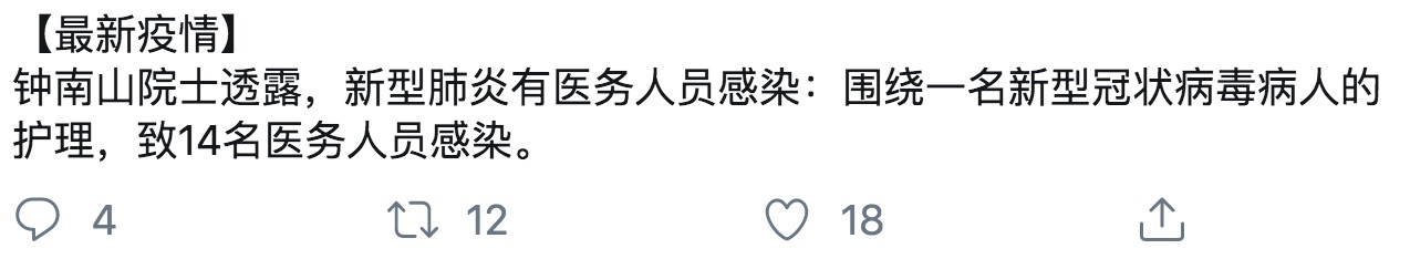 武漢衞健委於凌晨2時發佈最新情況,當地共有15名醫護人員感染新型冠狀病毒,另有1疑似病例。16名患者中,1例情況嚴重,其餘病情穩定,均被隔離治療。