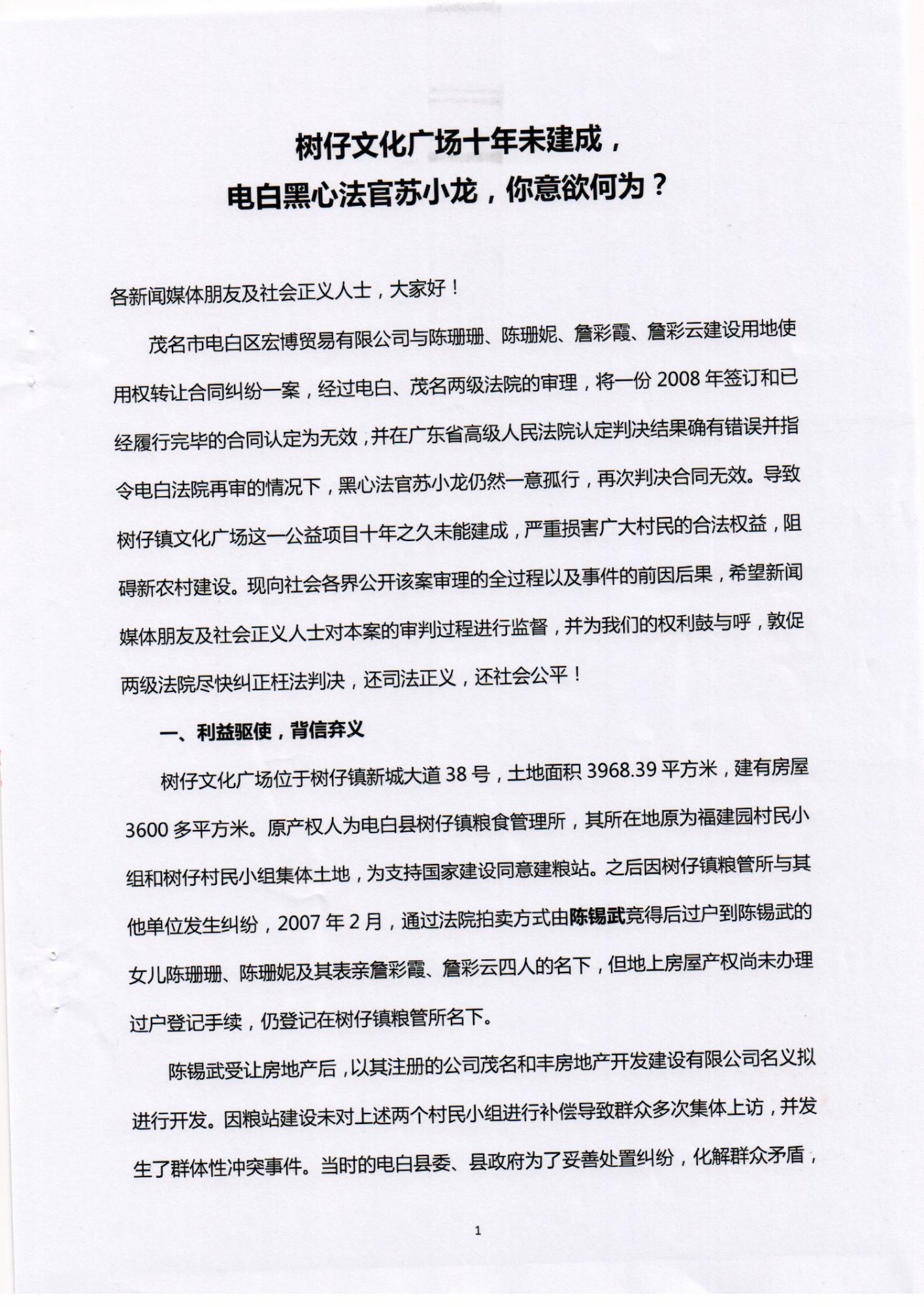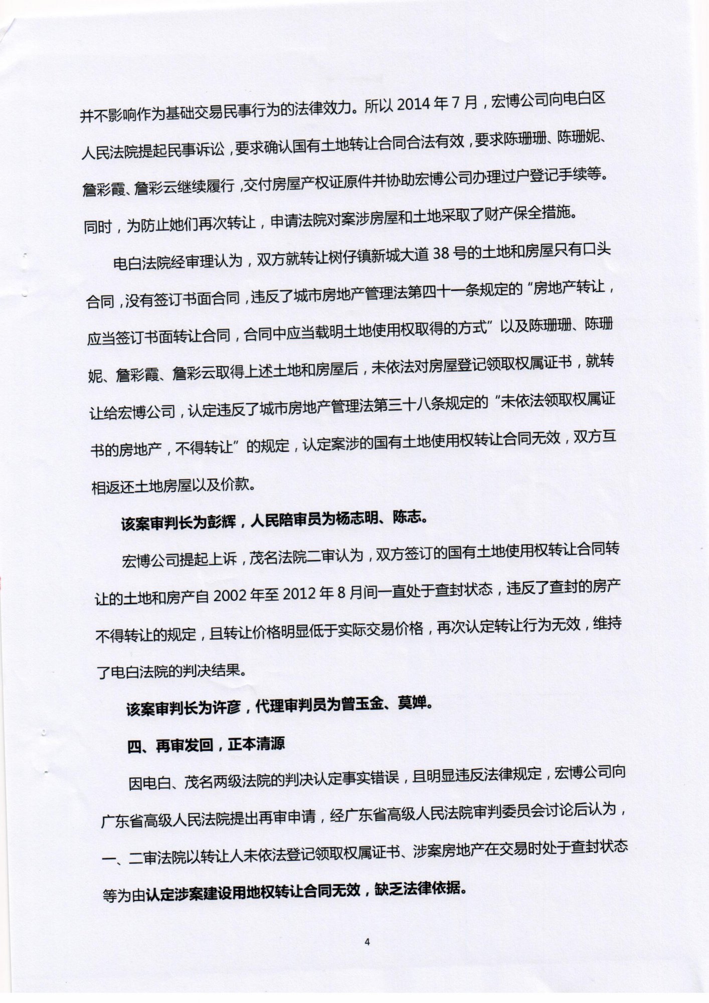 茂名市电白区宏博贸易有限公司与陈珊珊、陈珊妮、詹彩霞、詹彩云建设用地使用权转让合同纠纷一案,经过电白、茂名两级法院的审理,将一份2008年签订和已经履行完毕的合同认定为无效,并在广东省高级人民法院认定判决结果确有错误并指令电白法院再审的情况下,黑心法官苏小龙仍然一意孤行,再次判决合同无效。导致树仔镇文化广场这一公益项目十年之久未能建成,严重损害广大村民的合法权益,阻碍新农村建设。现向社会各界公开该案审理的全过程以及事件的前因后果,希望新闻媒体朋友及社会正义人士对本案的审判过程进行监督,并为我们的权利鼓与呼,敦促两级法院尽快纠正枉法判决,还司法正义,还社会公平!