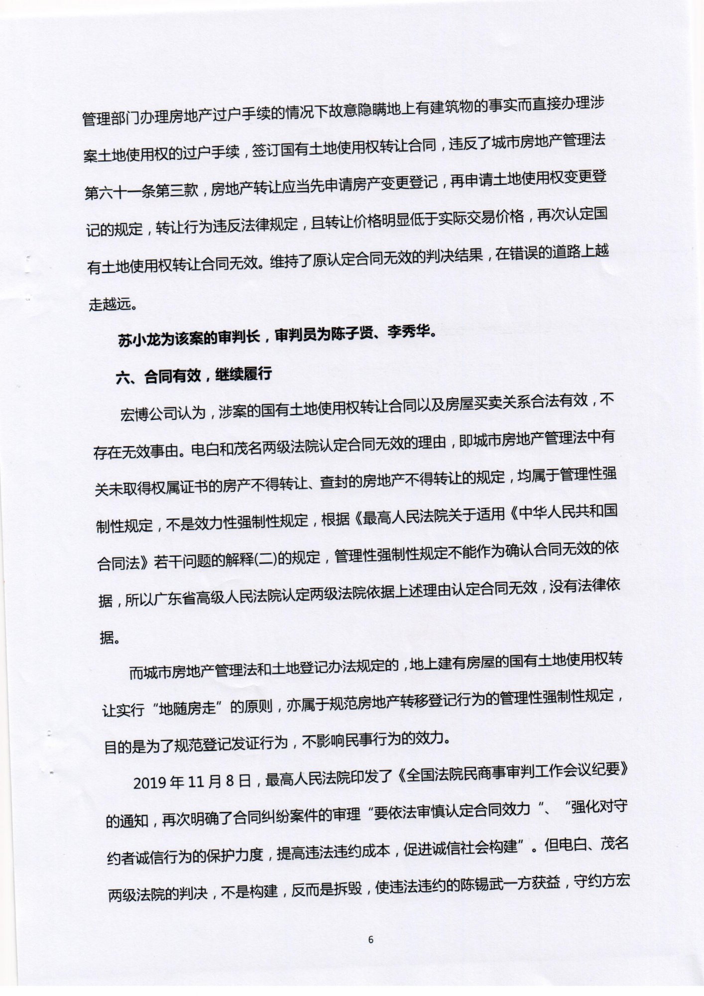 2019年11月8日,最高人民法院印发了《全国法院民商事审判工作会议纪要》的通知,再次明确了合同纠纷案件的审理“要依法审慎认定合同效力“、“强化对守约者诚信行为的保护力度,提高违法违约成本,促进诚信社会构建”。但电白、茂名两级法院的判决,不是构建,反而是拆毁,使违法违约的陈锡武一方获益,守约方宏博公司蒙受损失,也使得树仔文化广场这一社会公益项目蒙羞,十年不能落地,使捐资奉献的人伤心。