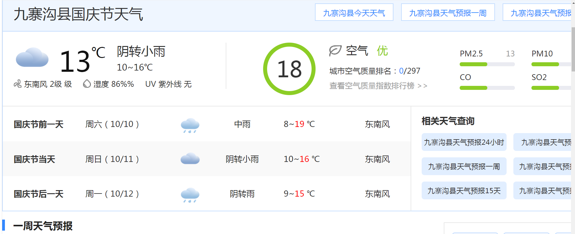 周四/10月08日 [FONT=黑体]九寨沟天气预报[/FONT] 14℃ [FONT=黑体]小雨持续无风向微风11~17℃ PM2.5值:24 优[/FONT] 今天10月08日小雨11 ~ 17℃ 明天10月09日小雨12 ~ 18℃ 周六10月10日小雨12 ~ 19℃ 周日10月11日小雨11 ~ 18℃ 周一10月12日小雨 中国气象局2020年10月08日21时发布 [URL='http://info.so.360.cn/feedback.html?src=tianqi'] tianqi.so.com 2020-10-08[/URL]